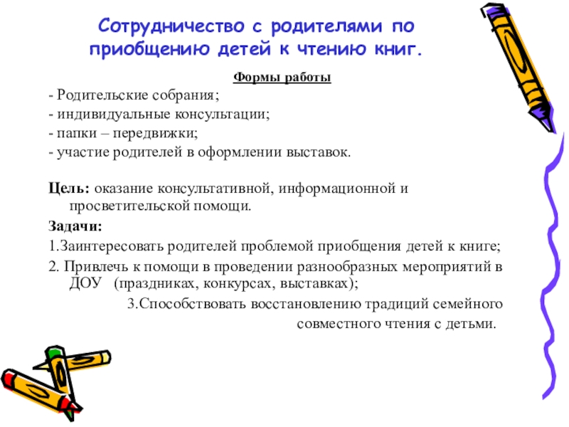 1.Заинтересовать родителей проблемой приобщения детей к книге;