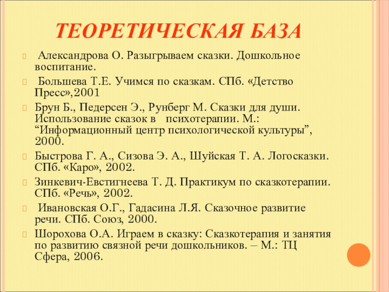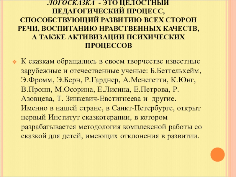 К сказкам обращались в своем творчестве известные зарубежные и отечественные ученые: Б.Беттельхейм, Э.Фромм, Э.Берн, Р.Гарднер, А.Менегетти, К.Юнг, В.Пропп, М.Осорина, Е.Лисина, Е.Петрова, Р.Азовцева, Т. Зинкевич-Евстигнеева и другие. Именно в нашей стране, в Санкт-Петербурге, открыт первый Институт сказкотерапии, в котором разрабатывается методология комплексной работы со сказкой для детей, имеющих отклонения в развитии.