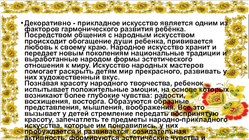 Декоративно - прикладное искусство является одним из факторов гармонического развития ребёнка.