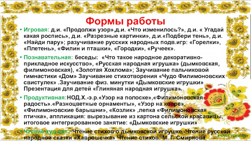 Познавательная: беседы: «Что такое народное декоративно-прикладное искусство», «Русская народная игрушка» (дымковская, филимоновская), «Золотая Хохлома»; Заучивание пальчиковой гимнастики «Дом» Заучивание стихотворения «Чудо Филимоновских свистулек» .Заучивание физ. минутки «Дымковские игрушки» Презентация для детей «Глиняная народная игрушка».