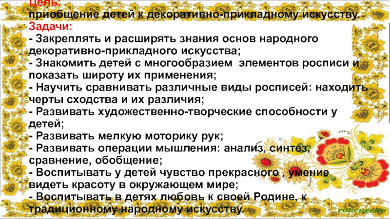 - Воспитывать в детях любовь к своей Родине, к традиционному народному искусству.