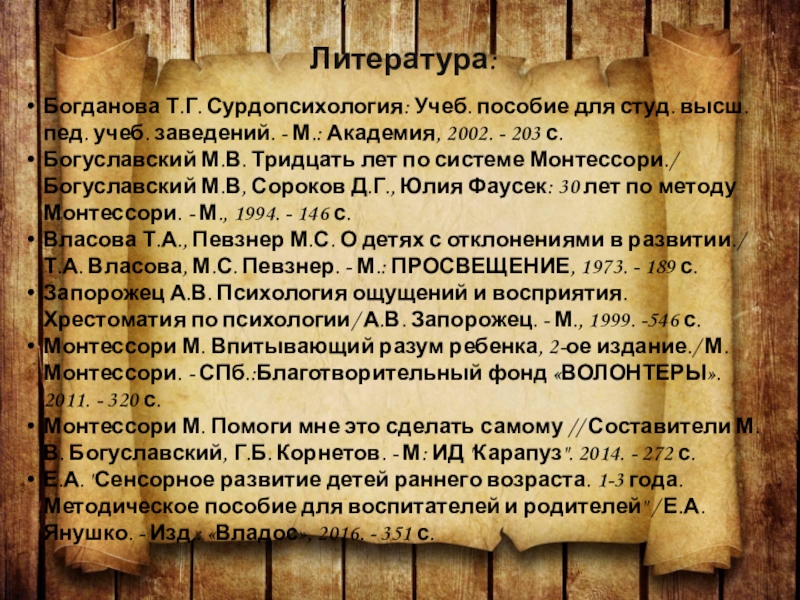 Богуславский М.В. Тридцать лет по системе Монтессори./ Богуславский М.В, Сороков Д.Г., Юлия Фаусек: 30 лет по методу Монтессори. - М., 1994. - 146 с.