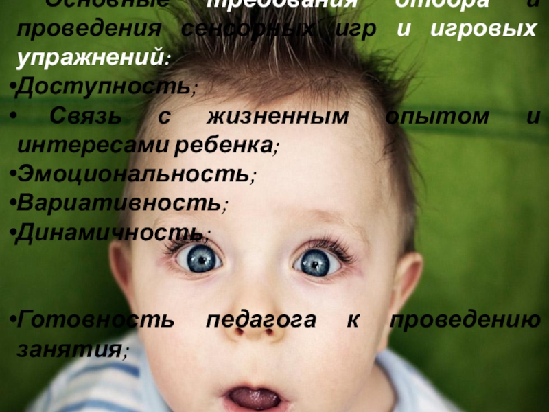 Слайд 9 Основные требования отбора и проведения сенсорных игр и игровых упражнений: