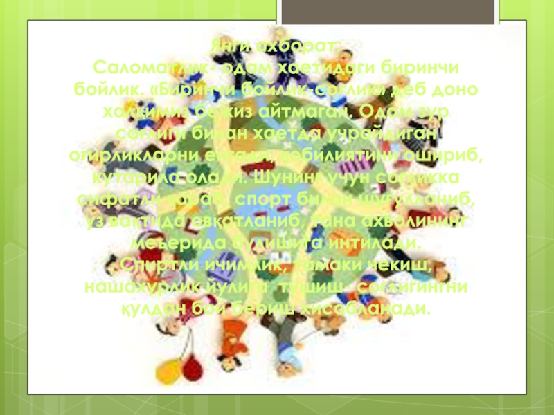 Слайд 5Янги ахборат: Саломатлик- одам хаетидаги биринчи бойлик. «Биринчи бойлик-соғлик» деб доно халқимиз