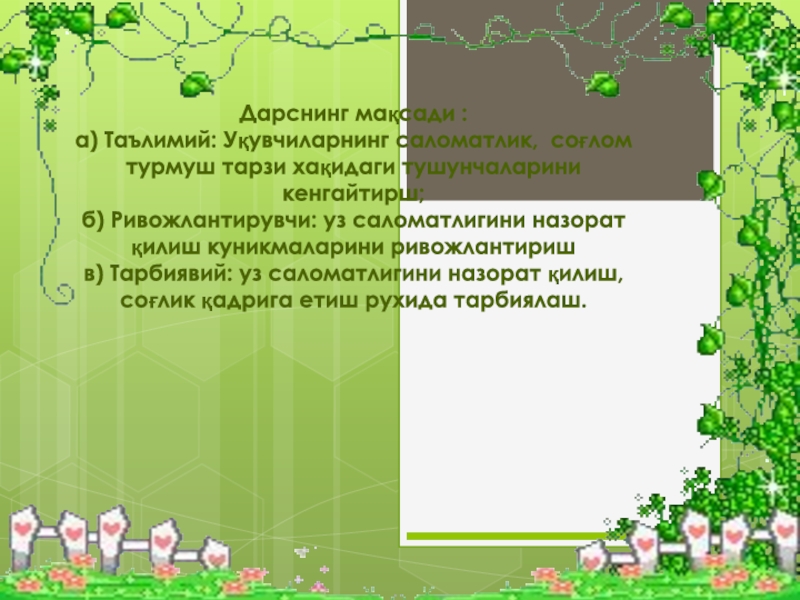 Слайд 3 Дарснинг мақсади : а) Таълимий: Уқувчиларнинг саломатлик, соғлом турмуш тарзи хақидаги тушунчаларини