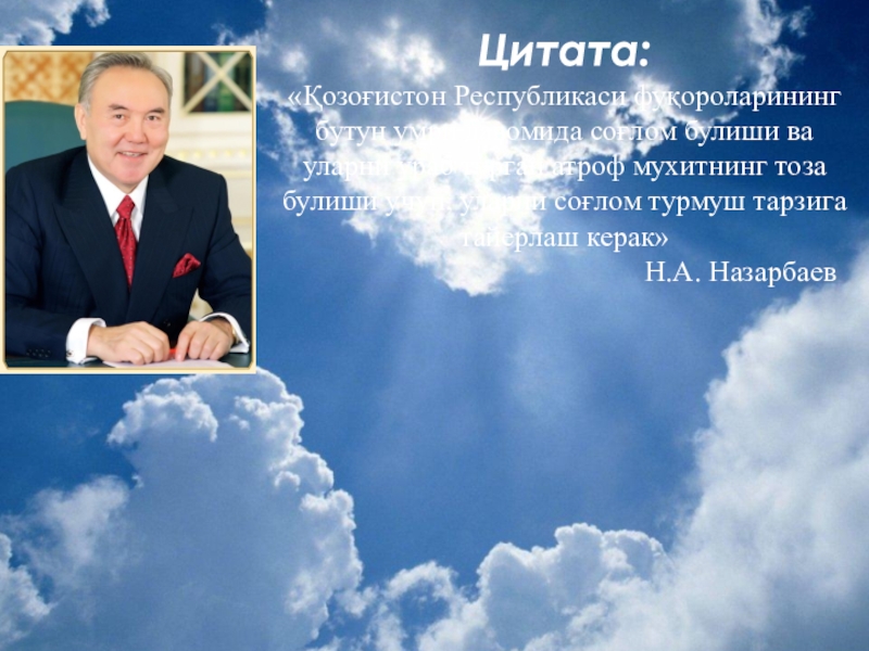 Цитата: «Қозоғистон Республикаси фуқороларининг бутун умри давомида соғлом булиши ва уларни ураб турган атроф