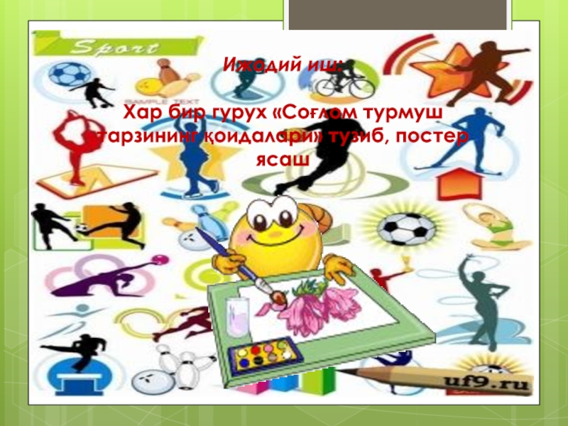 Слайд 7Ижодий иш: Хар бир гурух «Соғлом турмуш тарзининг қоидалари» тузиб, постер ясаш