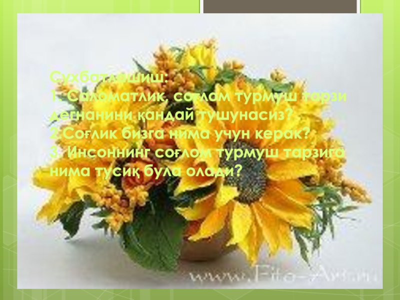 Слайд 4Сухбатлашиш: 1. Саломатлик, соғлом турмуш тарзи дегнанини қандай тушунасиз? 2.Соғлик бизга нима учун