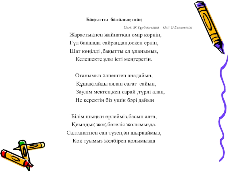 Сөзі: Ж Тұрбековтікі Әні: Ә Еспаевтікі