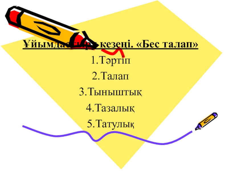 Слайд 3Ұйымдастыру кезеңi. «Бес талап»