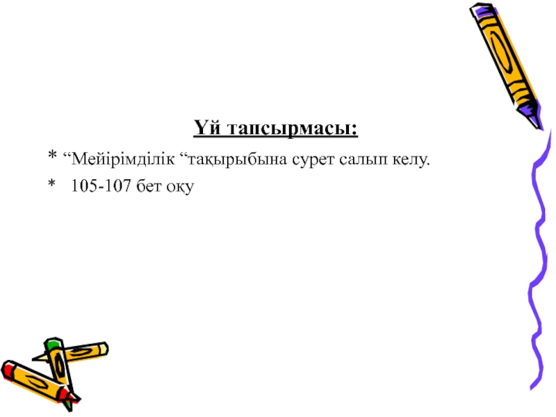 Үй тапсырмасы:* “Мейірімділік “тақырыбына сурет салып келу.*  105-107 бет оқу