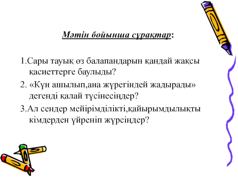 Слайд 9Мәтін бойынша сұрақтар: