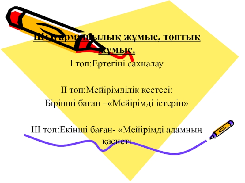 Шығармашылық жұмыс, топтық жұмыс.І топ:Ертегіні сахналауІІ топ:Мейірімділік кестесі:Бірінші баған –«Мейірімді істерің»ІІІ топ:Екінші баған- «Мейірімді адамның қасиеті