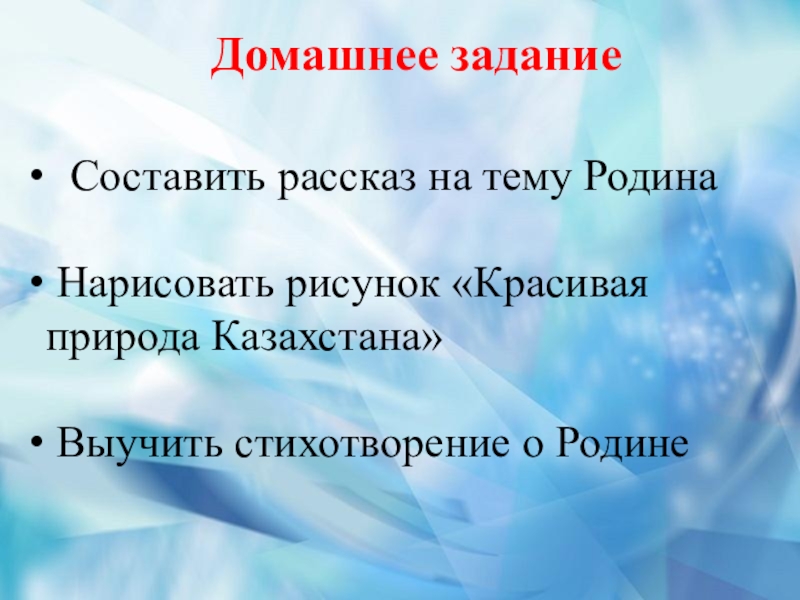 Домашнее задание  Составить рассказ на тему Родина Нарисовать рисунок «Красивая природа Казахстана» Выучить стихотворение о Родине