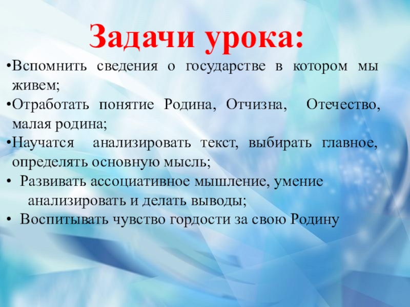 Задачи урока: Вспомнить сведения о государстве в котором мы живем;Отработать понятие Родина, Отчизна, Отечество, малая родина; Научатся
