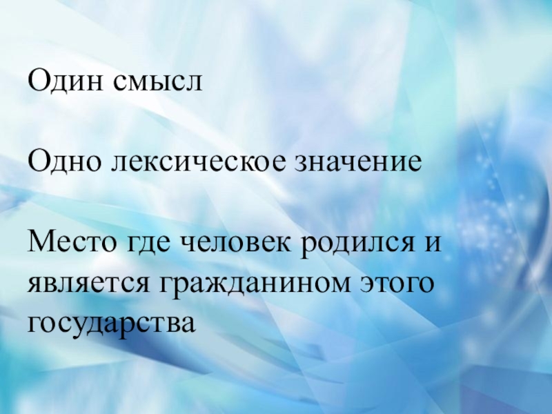 Один смысл Одно лексическое значение Место где человек родился и является гражданином этого государства