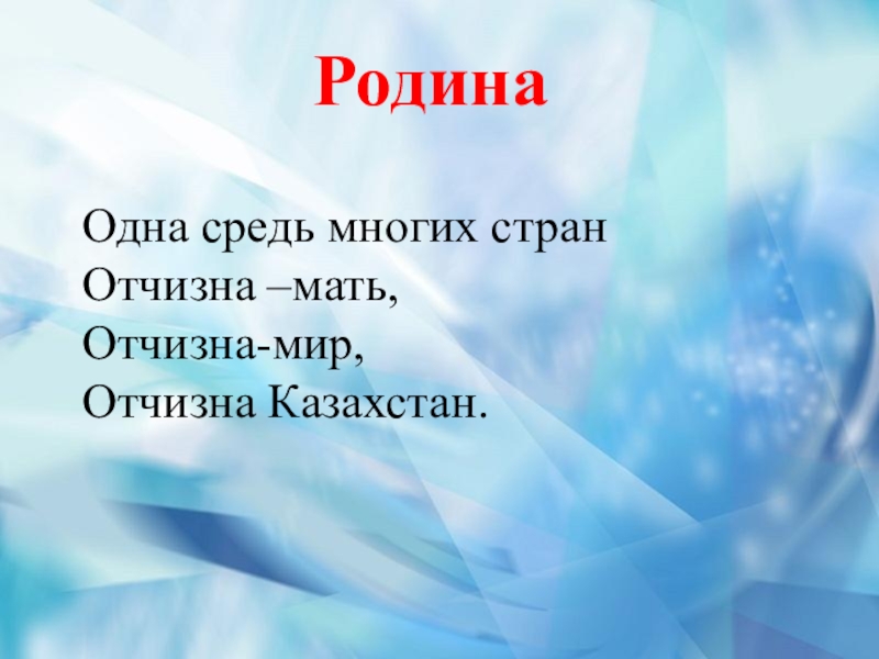 РодинаОдна средь многих странОтчизна –мать,Отчизна-мир,Отчизна Казахстан.