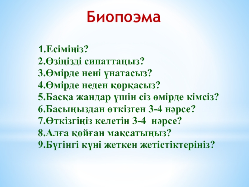 Биопоэма1.Есіміңіз?2.Өзіңізді сипаттаңыз?3.Өмірде нені ұнатасыз?4.Өмірде неден қорқасыз?5.Басқа жандар үшін сіз өмірде кімсіз?6.Басыңыздан өткізген 3-4 нәрсе?7.Өткізгіңіз келетін 3-4 нәрсе?8.Алға