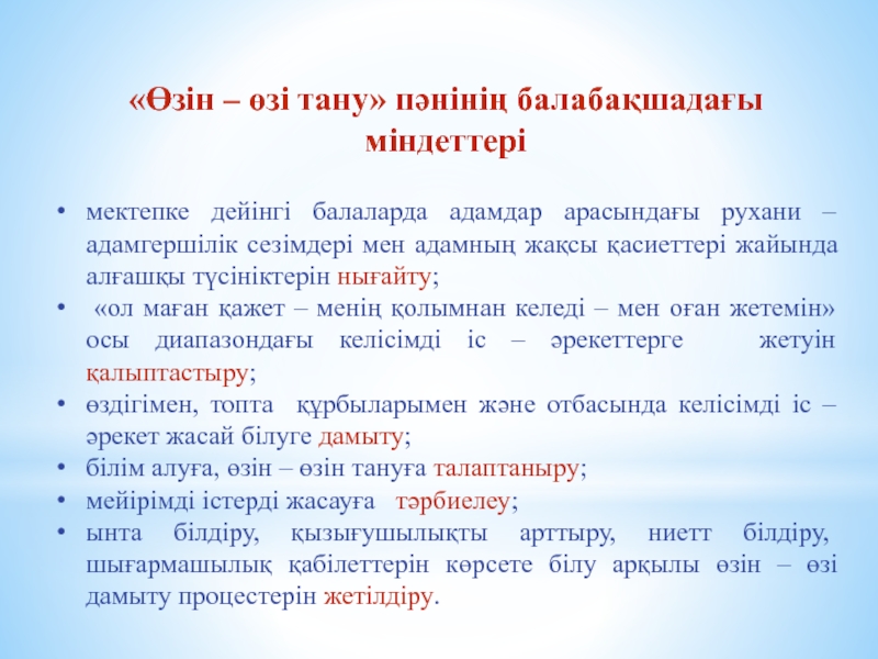 Слайд 4«Өзін – өзі тану» пәнінің балабақшадағы міндеттері
