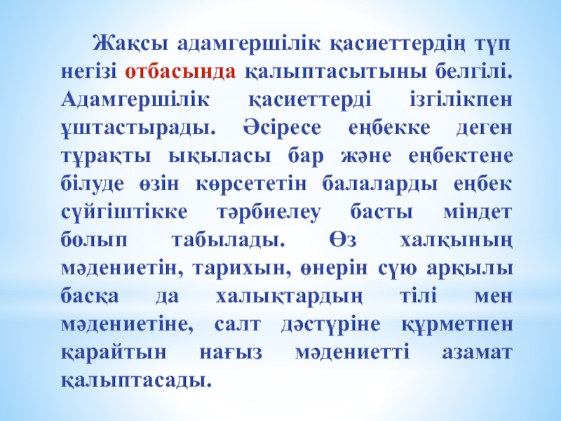 қасиеттерді ізгілікпен ұштастырады. Әсіресе еңбекке деген тұрақты ықыласы бар және еңбектене білуде өзін көрсететін балаларды еңбек сүйгіштікке тәрбиелеу басты міндет болып табылады. Өз халқының мәдениетін, тарихын, өнерін сүю арқылы басқа да халықтардың тілі мен мәдениетіне, салт дәстүріне құрметпен қарайтын нағыз мәдениетті азамат қалыптасады.