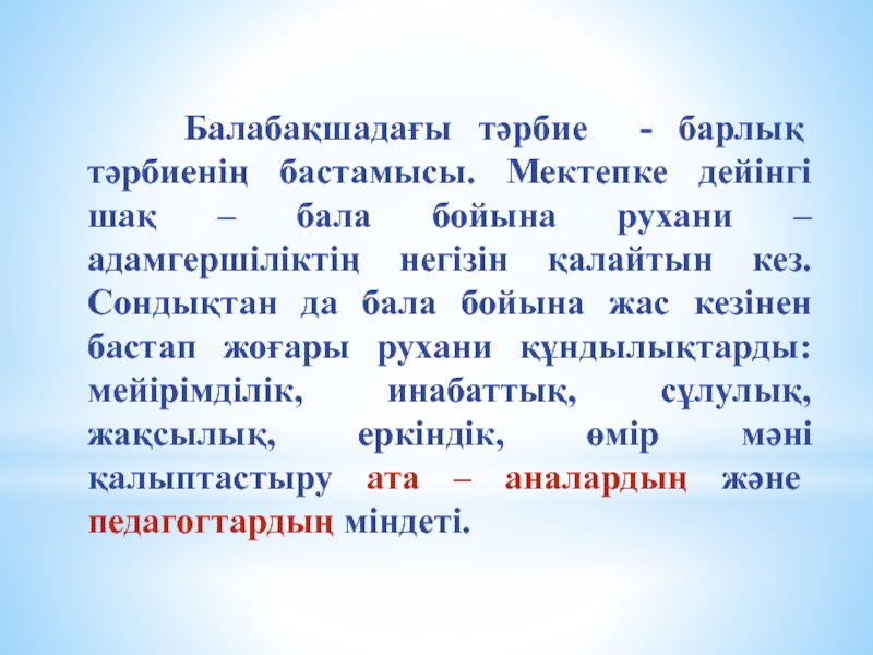 – бала бойына рухани – адамгершіліктің негізін қалайтын кез. Сондықтан да бала бойына жас кезінен бастап жоғары рухани құндылықтарды: мейірімділік, инабаттық, сұлулық, жақсылық, еркіндік, өмір мәні қалыптастыру ата – аналардың және педагогтардың міндеті.