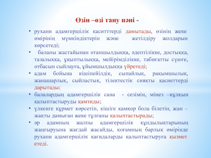 Өзін –өзі тану пәні -рухани адамгершілік қаситттерді дамытады, өзінің жеке өмірінің мүмкіндіктерін және жетілдіру жолдарын көрсетеді; баланы