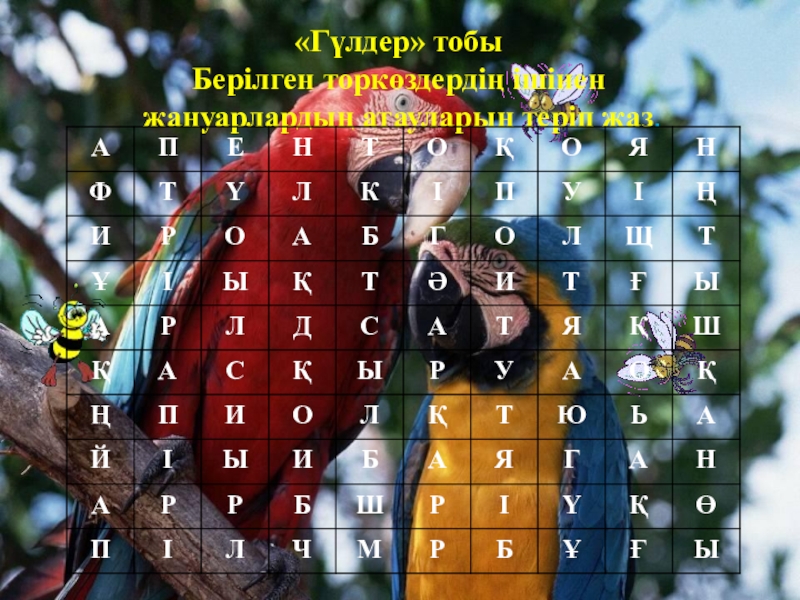 «Гүлдер» тобыБерілген торкөздердің ішінен жануарлардың атауларын теріп жаз.