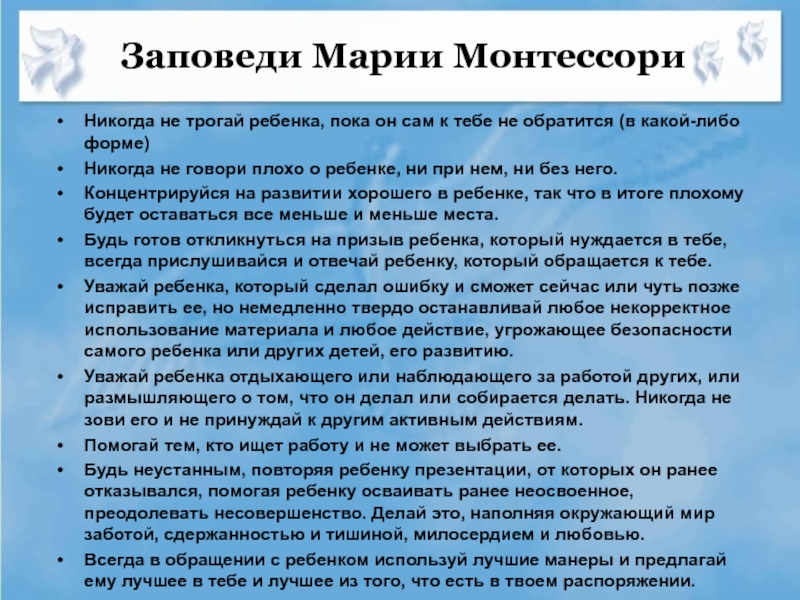 Слайд 4Заповеди Марии Монтессори