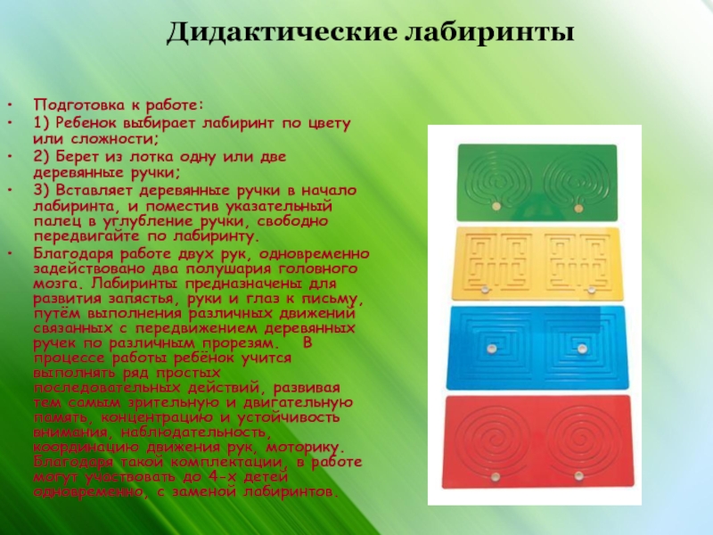 Благодаря работе двух рук, одновременно задействовано два полушария головного мозга. Лабиринты предназначены для развития запястья, руки и глаз к письму, путём выполнения различных движений связанных с передвижением деревянных ручек по различным прорезям. В процессе работы ребёнок учится выполнять ряд простых последовательных действий, развивая тем самым зрительную и двигательную память, концентрацию и устойчивость внимания, наблюдательность, координацию движения рук, моторику. Благодаря такой комплектации, в работе могут участвовать до 4-х детей одновременно, с заменой лабиринтов.