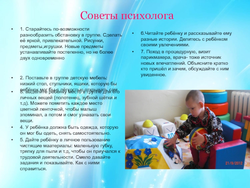 1. Старайтесь по-возможности разнообразить обстановку в группе. Сделать её яркой,