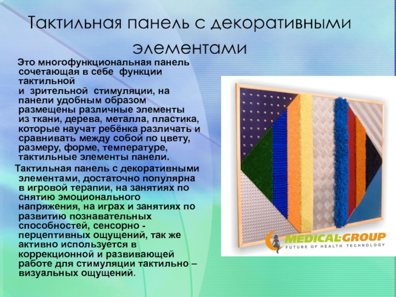 Слайд 16Тактильная панель с декоративными элементами