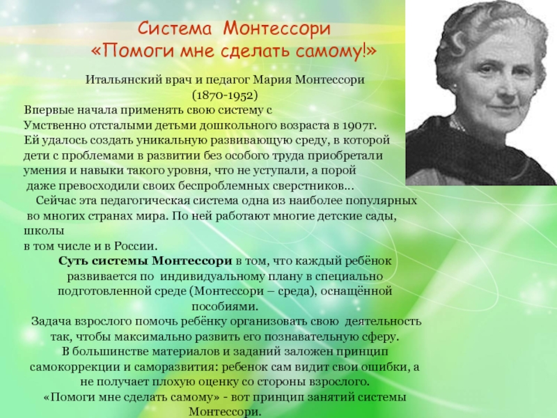 «Помоги мне сделать самому» - вот принцип занятий системы Монтессори.