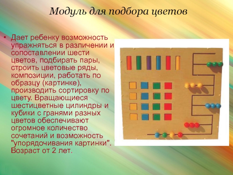 сопоставлении шести цветов, подбирать пары, строить цветовые ряды, композиции, работать по образцу (картинке), производить сортировку по цвету. Вращающиеся шестицветные цилиндры и кубики с гранями разных цветов обеспечивают огромное количество сочетаний и возможность "упорядочивания картинки". Возраст от 2 лет.