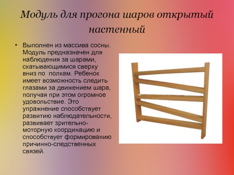 предназначен для наблюдения за шарами, скатывающимися сверху вниз по полкам. Ребенок имеет возможность следить глазами за движением шара, получая при этом огромное удовольствие. Это упражнение способствует развитию наблюдательности, развивает зрительно-моторную координацию и способствует формированию причинно-следственных связей.