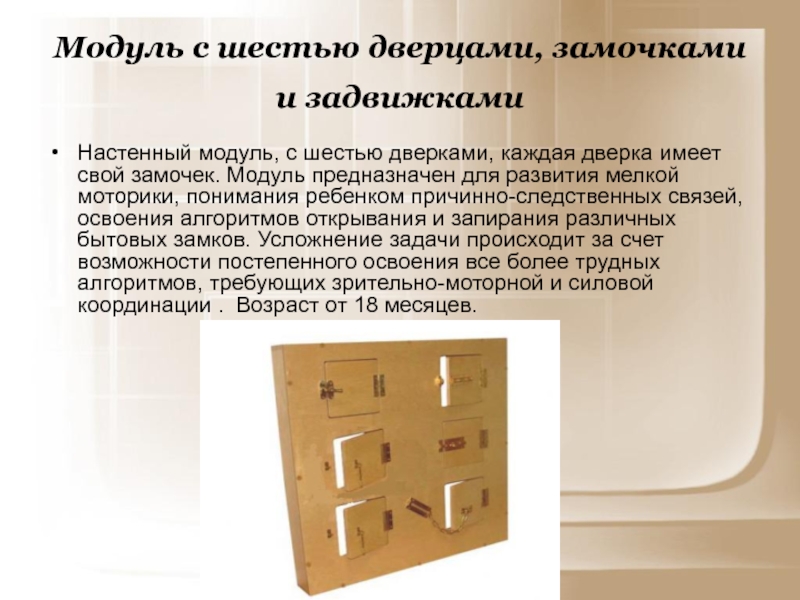 дверками, каждая дверка имеет свой замочек. Модуль предназначен для развития мелкой моторики, понимания ребенком причинно-следственных связей, освоения алгоритмов открывания и запирания различных бытовых замков. Усложнение задачи происходит за счет возможности постепенного освоения все более трудных алгоритмов, требующих зрительно-моторной и силовой координации . Возраст от 18 месяцев.