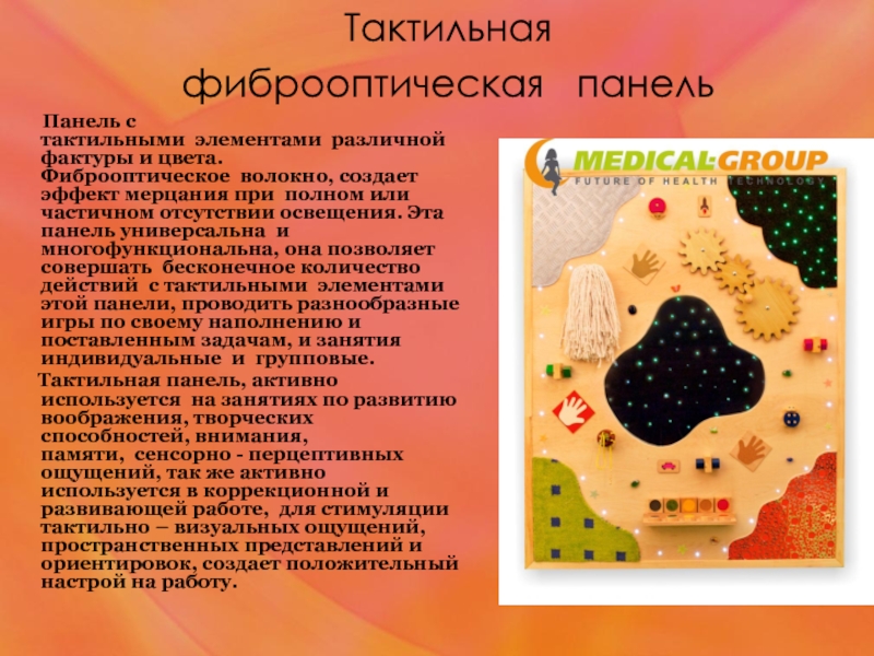 различной фактуры и цвета. Фиброоптическое волокно, создает эффект мерцания при полном или частичном отсутствии освещения. Эта панель универсальна и многофункциональна, она позволяет совершать бесконечное количество действий с тактильными элементами этой панели, проводить разнообразные игры по своему наполнению и поставленным задачам, и занятия индивидуальные и групповые.