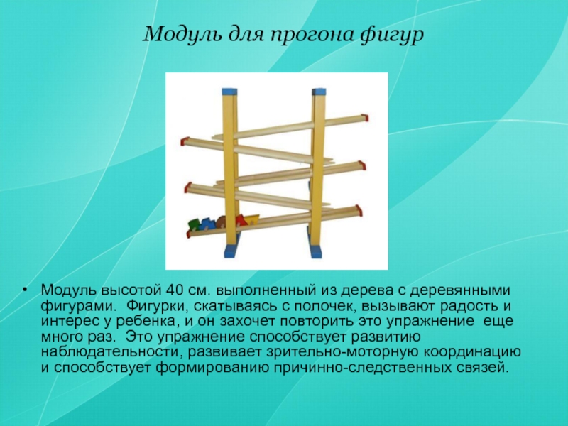 деревянными фигурами. Фигурки, скатываясь с полочек, вызывают радость и интерес у ребенка, и он захочет повторить это упражнение еще много раз. Это упражнение способствует развитию наблюдательности, развивает зрительно-моторную координацию и способствует формированию причинно-следственных связей.