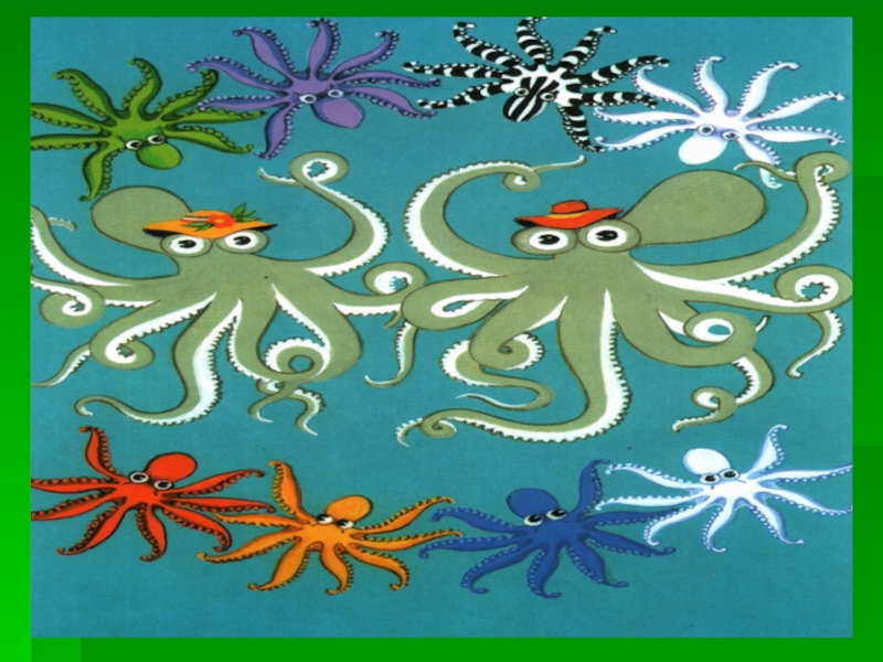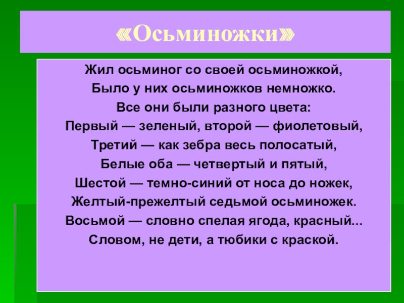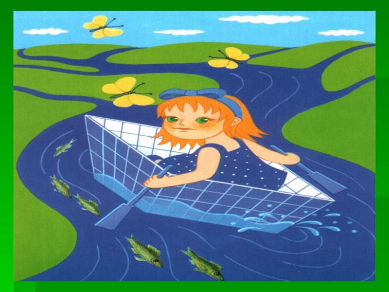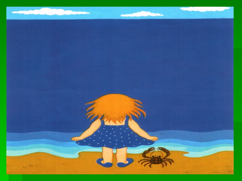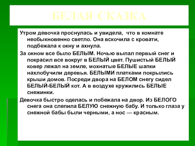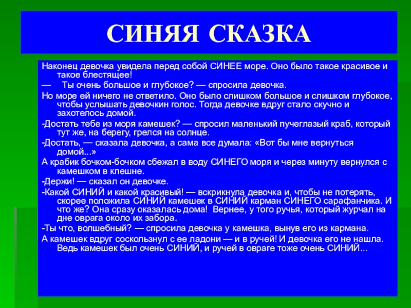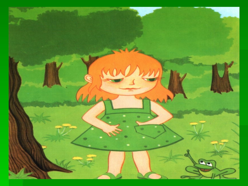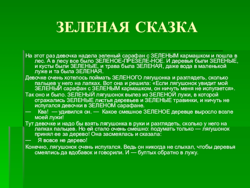 Так оно и было. ЗЕЛЕНЫЙ лягушонок вылез из ЗЕЛЕНОЙ лужи, в которой отражались ЗЕЛЕНЫЕ листья деревьев и ЗЕЛЕНЫЕ травинки, и ничуть не испугался девочки в ЗЕЛЕНОМ сарафане.