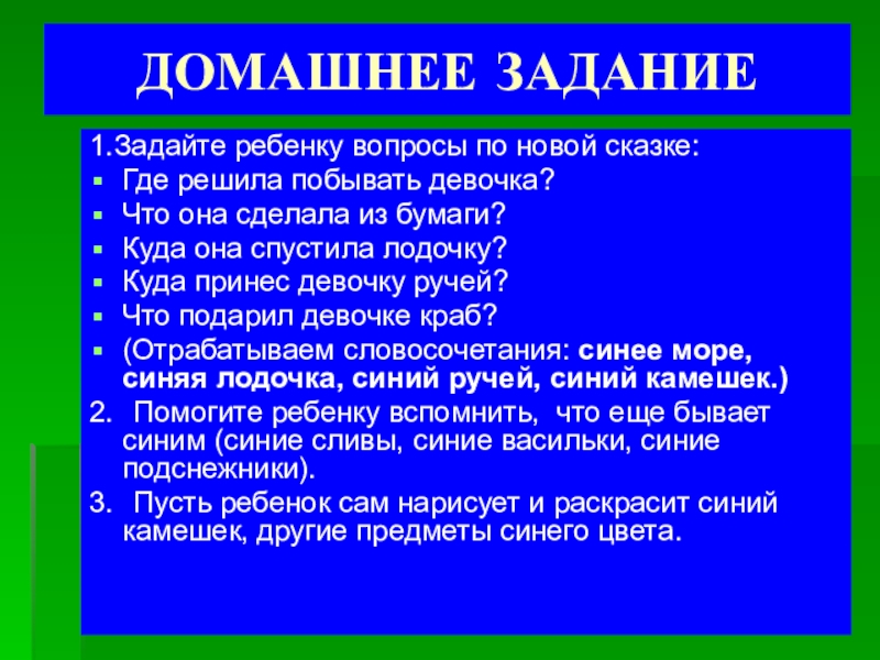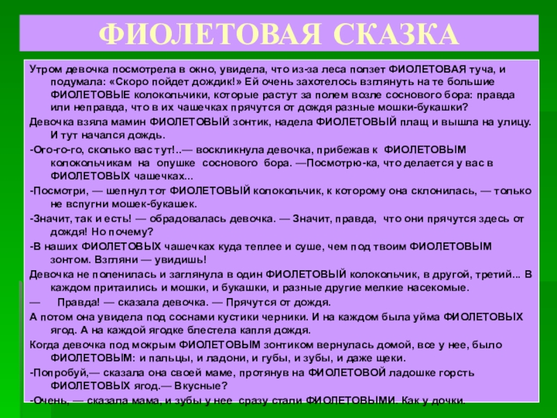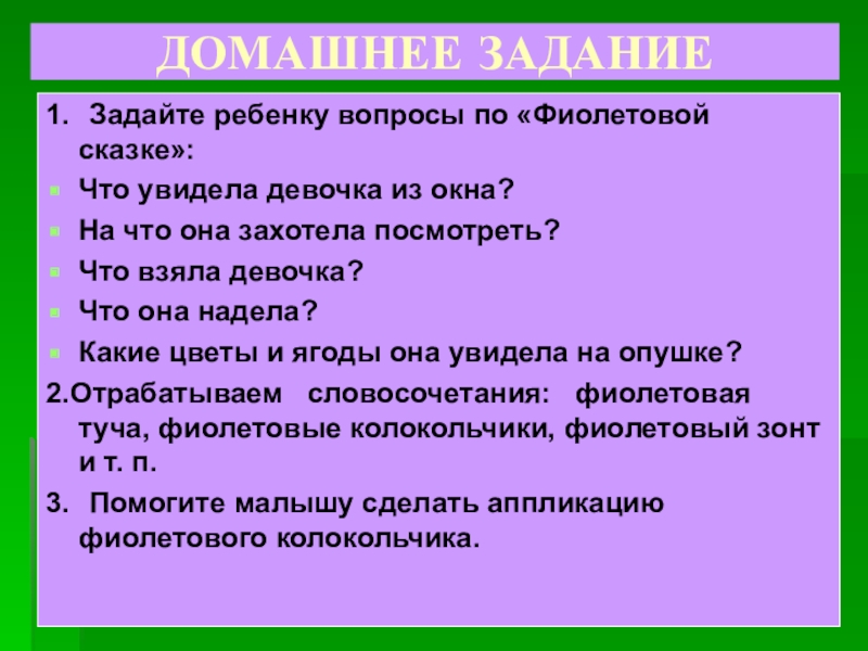 1. Задайте ребенку вопросы по «Фиолетовой сказке»: