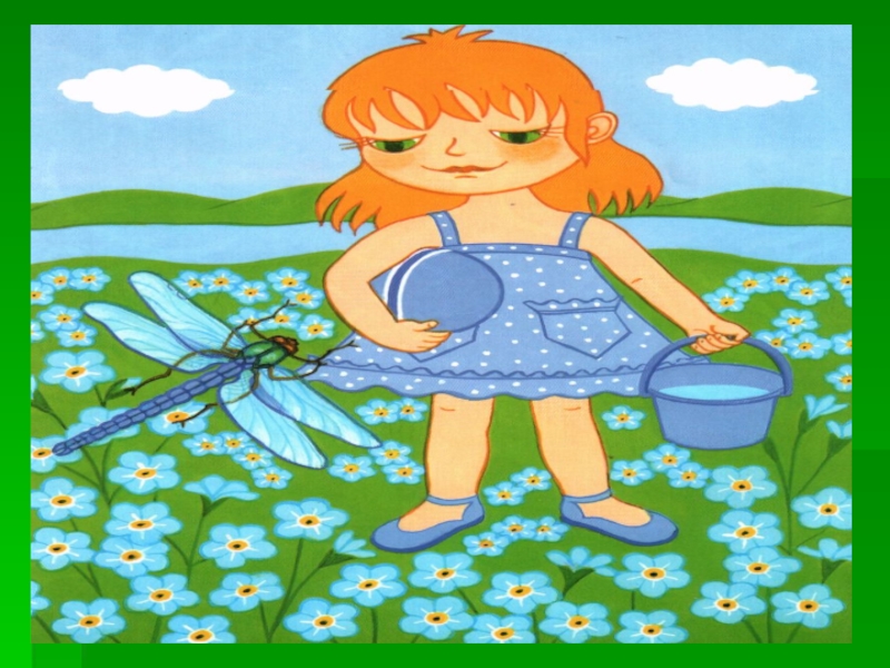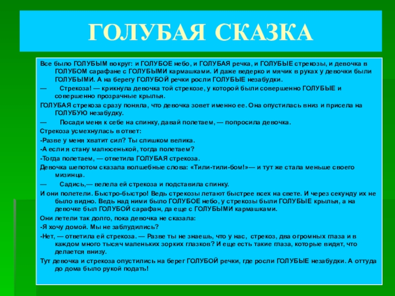 и ГОЛУБЫЕ стрекозы, и девочка в ГОЛУБОМ сарафане с ГОЛУБЫМИ кармашками. И даже ведерко и мячик в руках у девочки были ГОЛУБЫМИ. А на берегу ГОЛУБОЙ речки росли ГОЛУБЫЕ незабудки.
