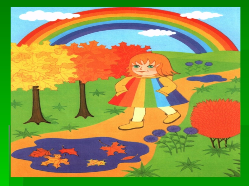 Вдруг в небе появилась радуга. Она была яркой, РАЗНОЦВЕТНОЙ. Девочка хотела запомнить, из каких цветов состоит радуга, но та растаяла так же быстро, как и появилась.