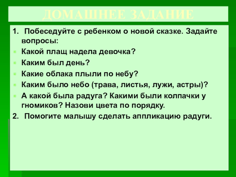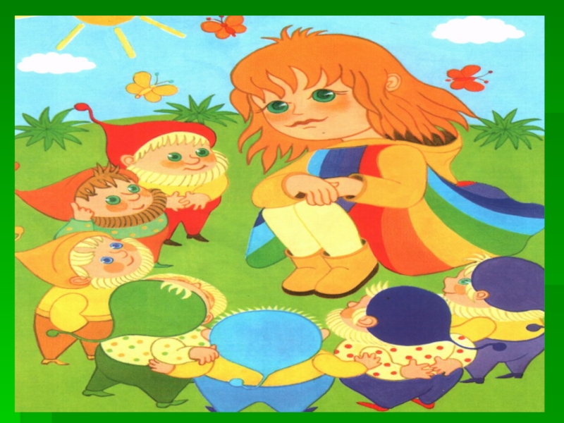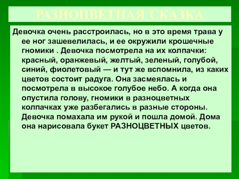 ног зашевелилась, и ее окружили крошечные гномики . Девочка посмотрела на их колпачки: красный, оранжевый, желтый, зеленый, голубой, синий, фиолетовый — и тут же вспомнила, из каких цветов состоит радуга. Она засмеялась и посмотрела в высокое голубое небо. А когда она опустила голову, гномики в разноцветных колпачках уже разбегались в разные стороны. Девочка помахала им рукой и пошла домой. Дома она нарисовала букет РАЗНОЦВЕТНЫХ цветов.