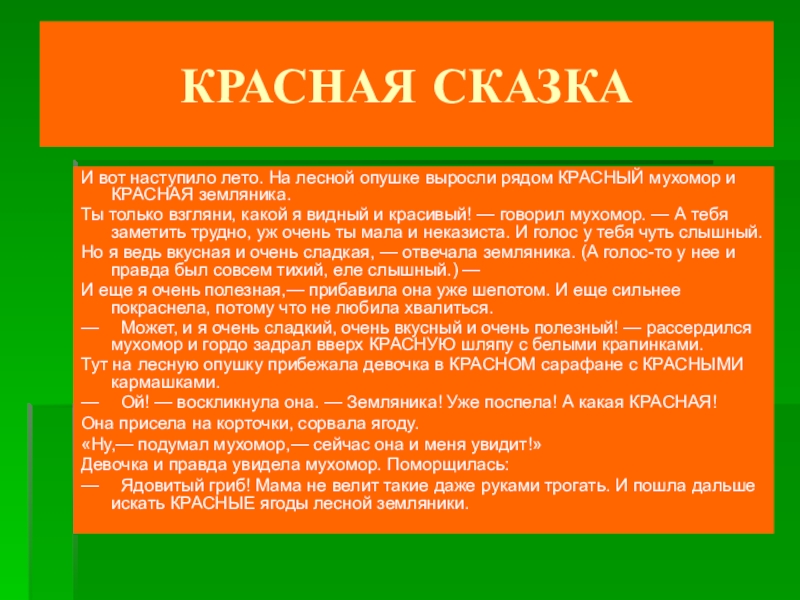 Тут на лесную опушку прибежала девочка в КРАСНОМ сарафане с КРАСНЫМИ кармашками.