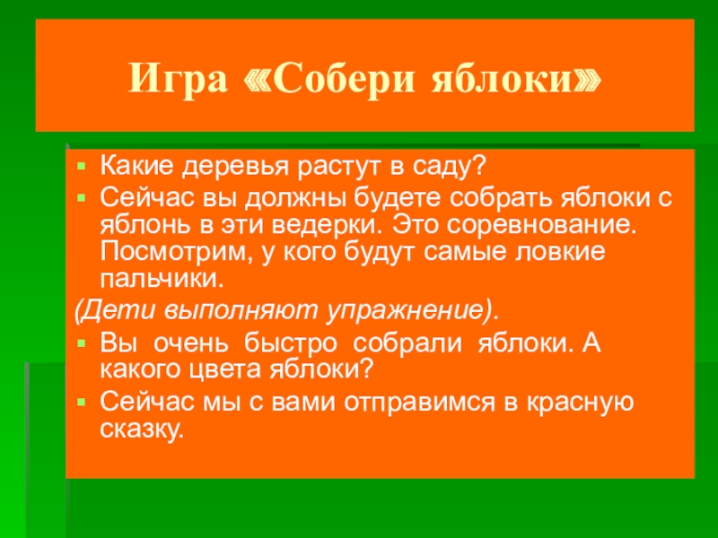 яблоки с яблонь в эти ведерки. Это соревнование. Посмотрим, у кого будут самые ловкие пальчики.