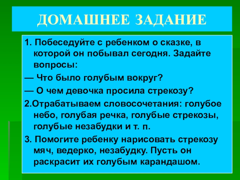 2.Отрабатываем словосочетания: голубое небо, голубая речка, голубые стрекозы, голубые незабудки и т. п.