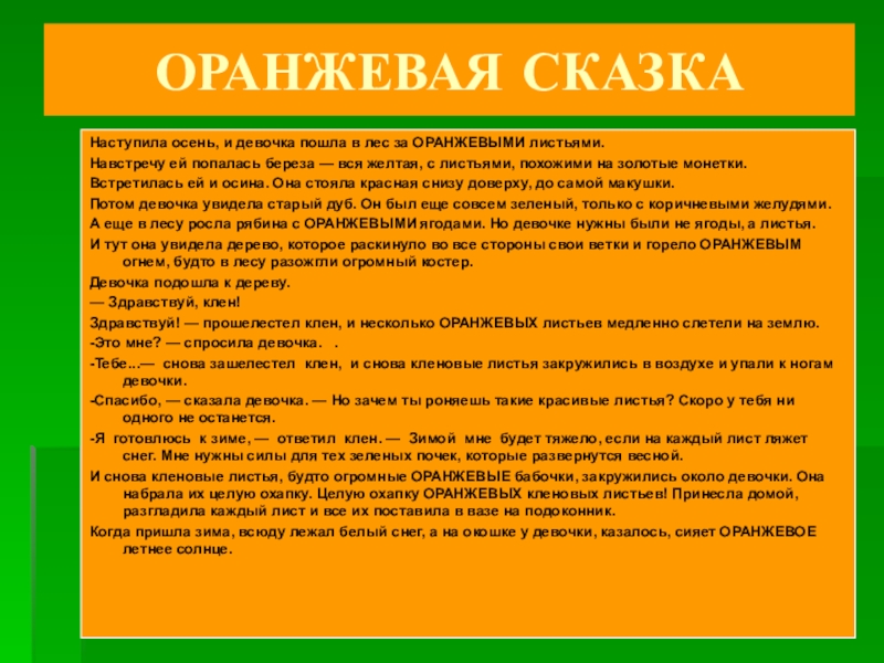 Здравствуй! — прошелестел клен, и несколько ОРАНЖЕВЫХ листьев медленно слетели на землю.
