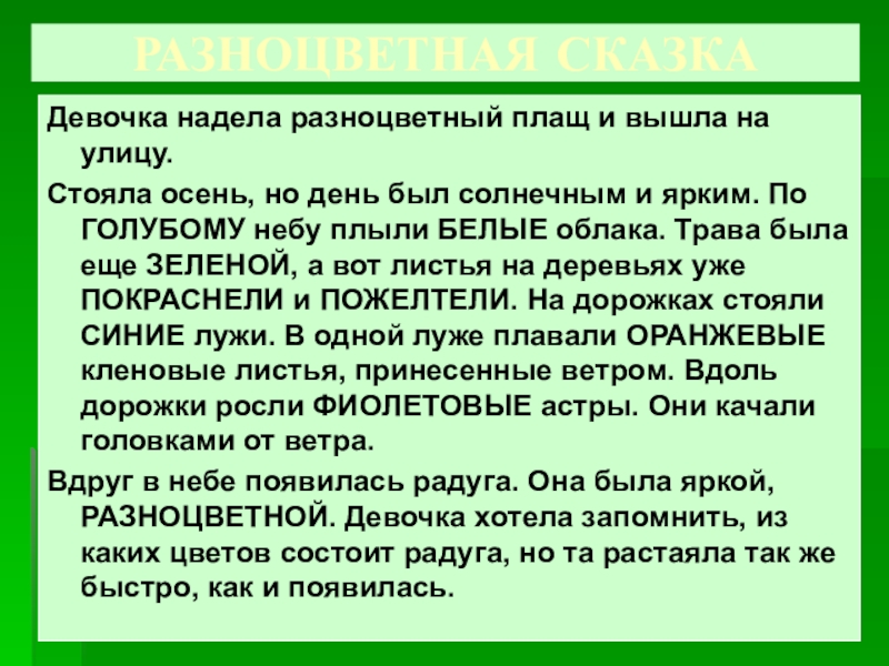 день был солнечным и ярким. По ГОЛУБОМУ небу плыли БЕЛЫЕ облака. Трава была еще ЗЕЛЕНОЙ, а вот листья на деревьях уже ПОКРАСНЕЛИ и ПОЖЕЛТЕЛИ. На дорожках стояли СИНИЕ лужи. В одной луже плавали ОРАНЖЕВЫЕ кленовые листья, принесенные ветром. Вдоль дорожки росли ФИОЛЕТОВЫЕ астры. Они качали головками от ветра.
