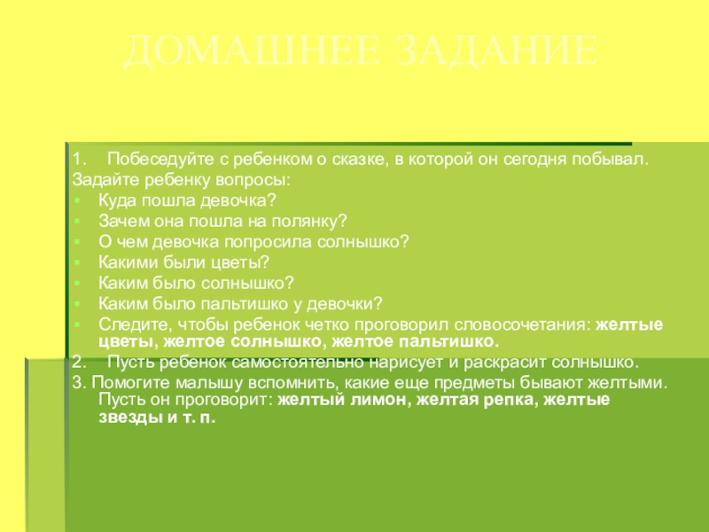 Следите, чтобы ребенок четко проговорил словосочетания: желтые цветы, желтое солнышко, желтое пальтишко.