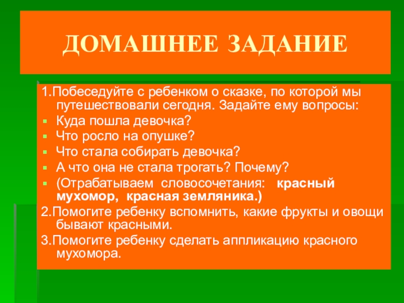 (Отрабатываем словосочетания: красный мухомор, красная земляника.)