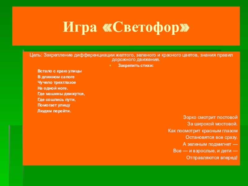 Цель: Закрепление дифференциации желтого, зеленого и красного цветов, знания правил